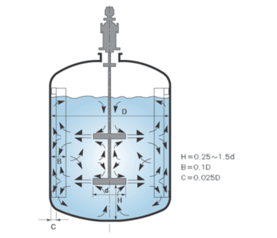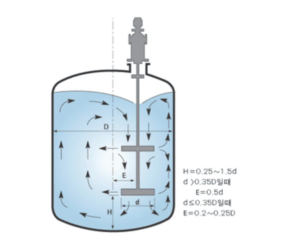편심 설치 또는 TANK내에 방해판(BAFFLE)를 설치하여 양혼한 난류 상태로 유도하며 보다 강력한 교반효과를 얻을 수 있습니다.