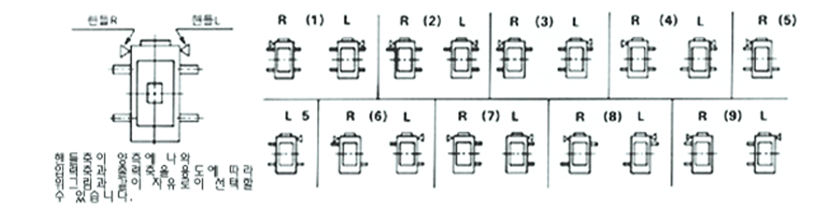 입·출력 축은 어느쪽이나 상관이 없으나 핸들 빙대 쪽의 축을 출력축으로 사용하는 것이 편리합니다.