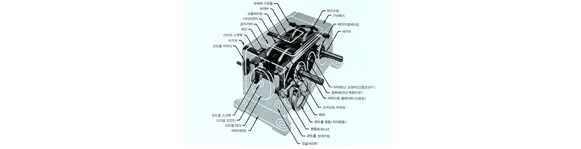 변속시에는 컨트롤핸들을 좌, 우로 돌려줌에 따라 입력축의 디스크 간격을 조절하여 원하는 속도를 자유자재로 얻을 수가 있습니다.