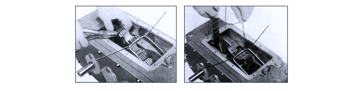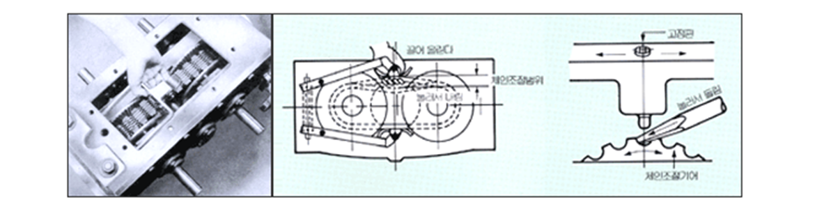 회전비가 부정확하고 CHAIN과 BEVEL DISC의 수명이 단축되므로 정기검사마다 텐숀조절기어를 돌려서 CHAIN을 조절하여 줍니다.