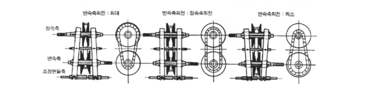P.I.V 변속기의 원리는 정속회전하는 입력축에 일정변속비안에서 출력축의 R.P.M을 자유로이 조절하여 원하는 회전 속도의 위치에 둘 수가 있습니다,