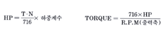 최고속 또는 최저속에 있어서의 사용마력 또는 그 중간속도에 있어 TORQUE가 최대가 될 때는 그 때의 회전수와 마력