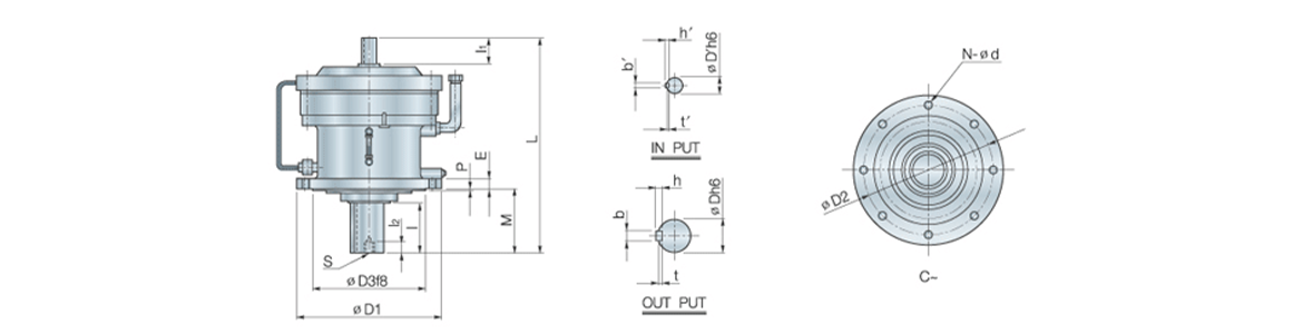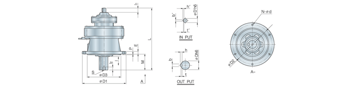 | 형식 | L | D | D' | D1 | D2 | D3 | E | M | N | P | S | d | I | I. | I, | b | h | t | b' | h' | t' | 중량 |
