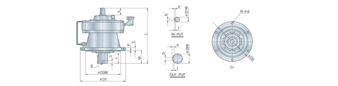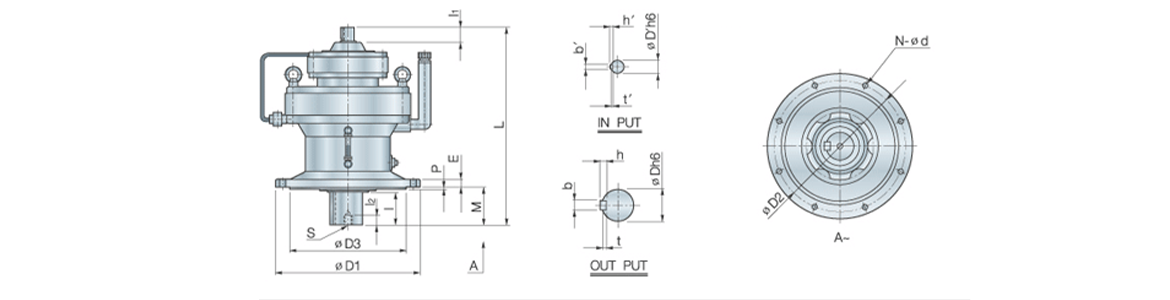 | 형식 | L | D | D' | D1 | D2 | D3 | E | M | N | P | d | I | I. | b | h | t | b' | h' | t' | 중량 |